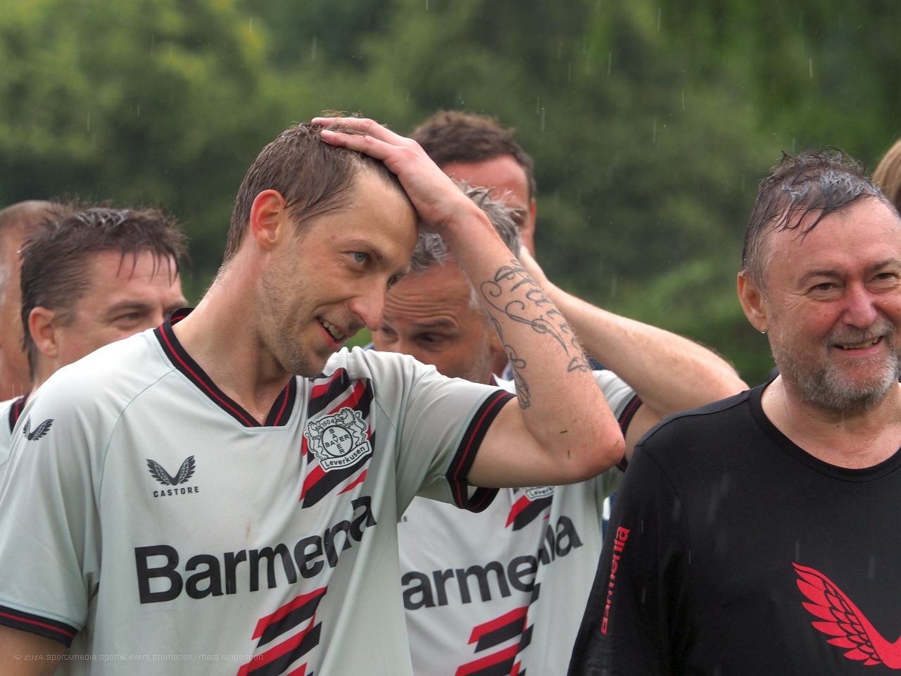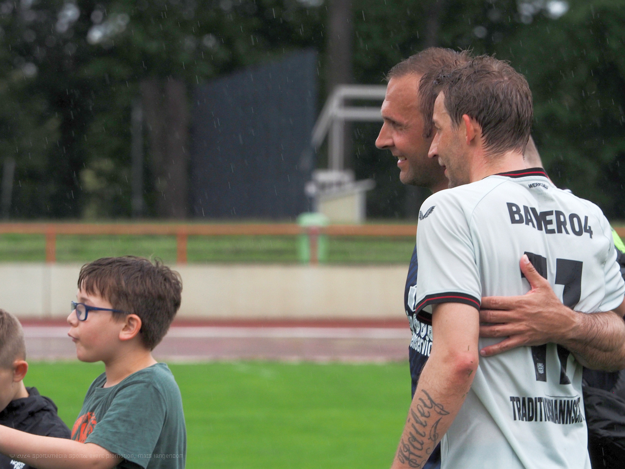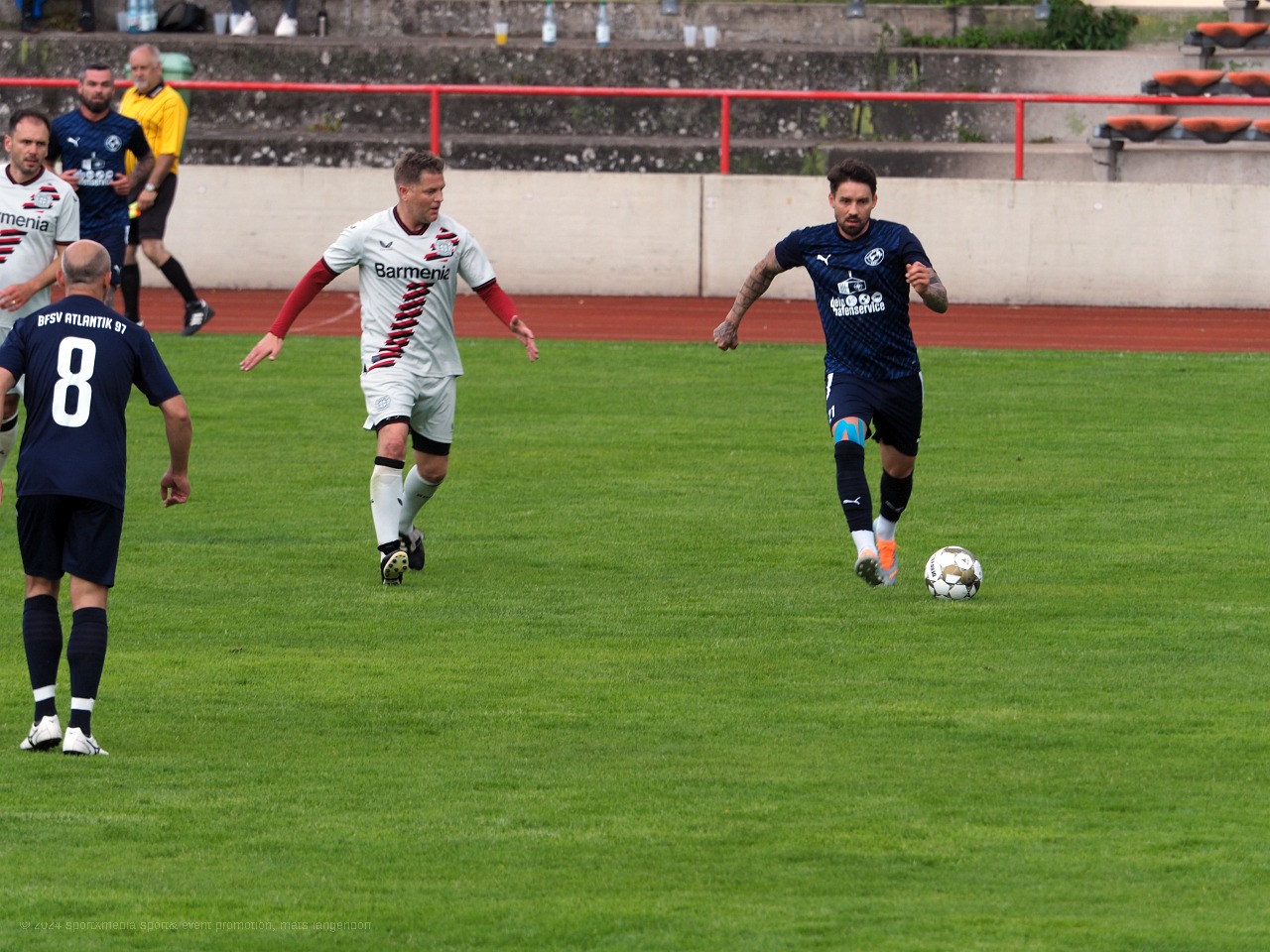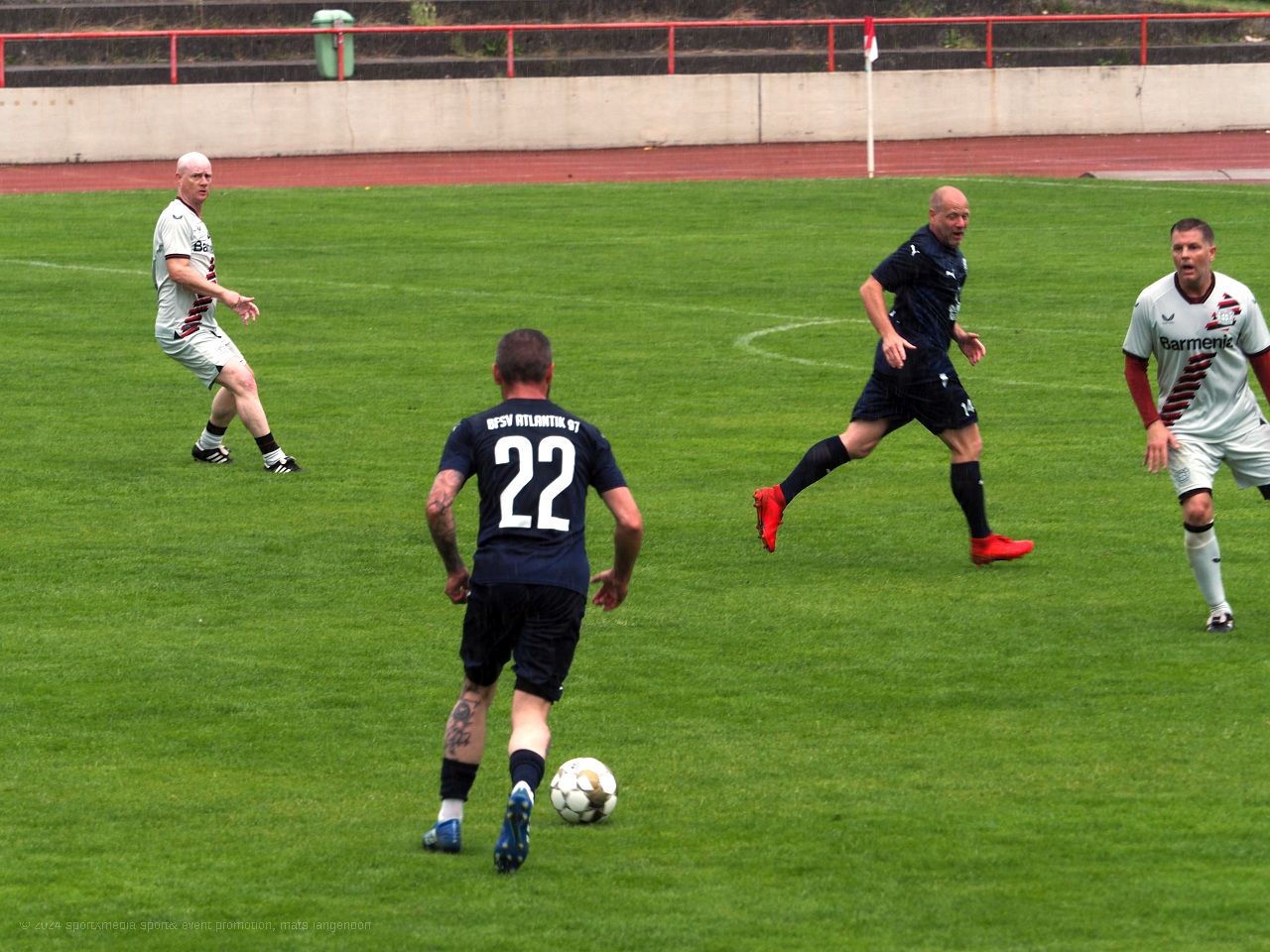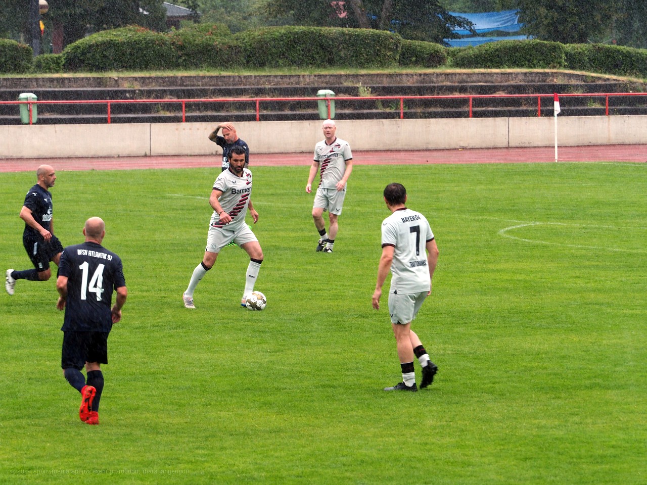 Das Tor zählte dann aber nicht, weil der Linienrichter eine Abseitsstellung eines Bayer Spielers monierte. Mit zunehmender Spieldauer fing es heftig an zu regnen, was aber am guten Niveau des Spiels nichts änderte. In der 10. Minute dann eine Riesenchance für den BFSV Atlantik, als ein Leverkusener Akteur gerade noch auf der Linie zur Ecke retten konnte. Die Ecke führte dann zum 1:0 für die Norddeutschen. Ein Kopfball eines Atlantik Angreifers landete unhaltbar für den Bayer Keeper im Tor. Zu diesem Zeitpunkt hieß der neue Deutsche Ü-40 Pokalsieger BFSV Atlantik 97. In der 14. Minute scheiterte Stefan Kießling mit einem fulminanten Schuss an BFSV Torhüter Danny Yayer. In der 15. Minute dann der Ausgleich für Leverkusen.