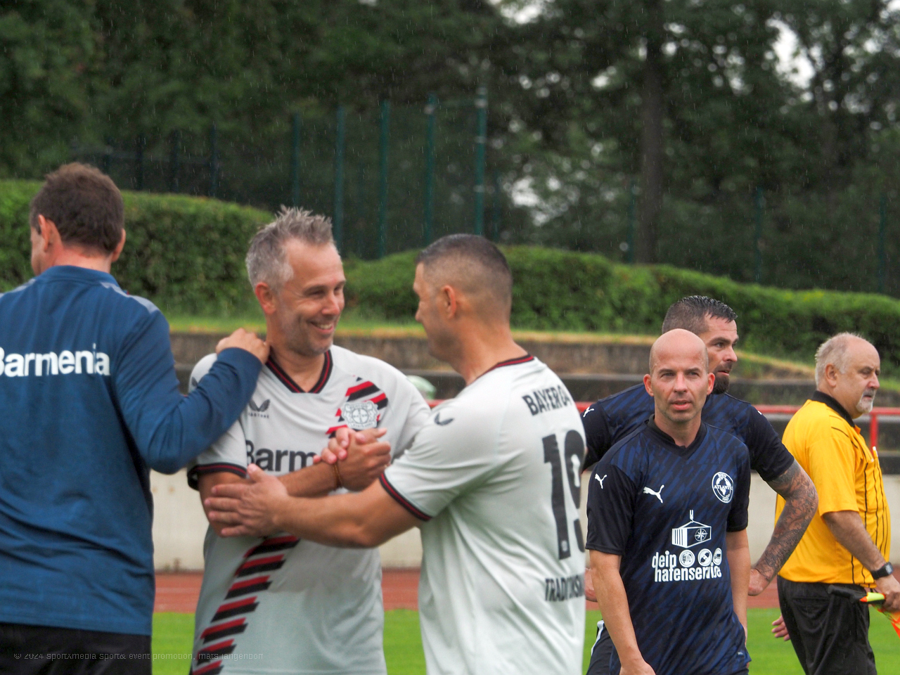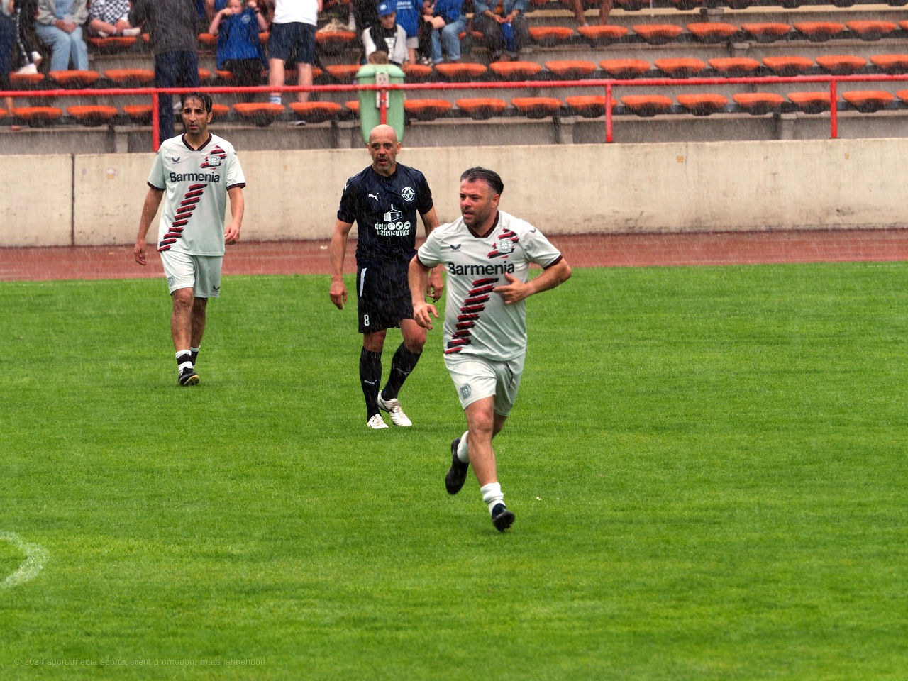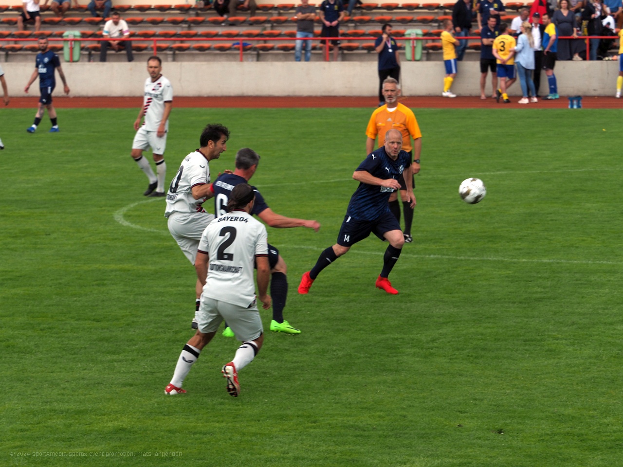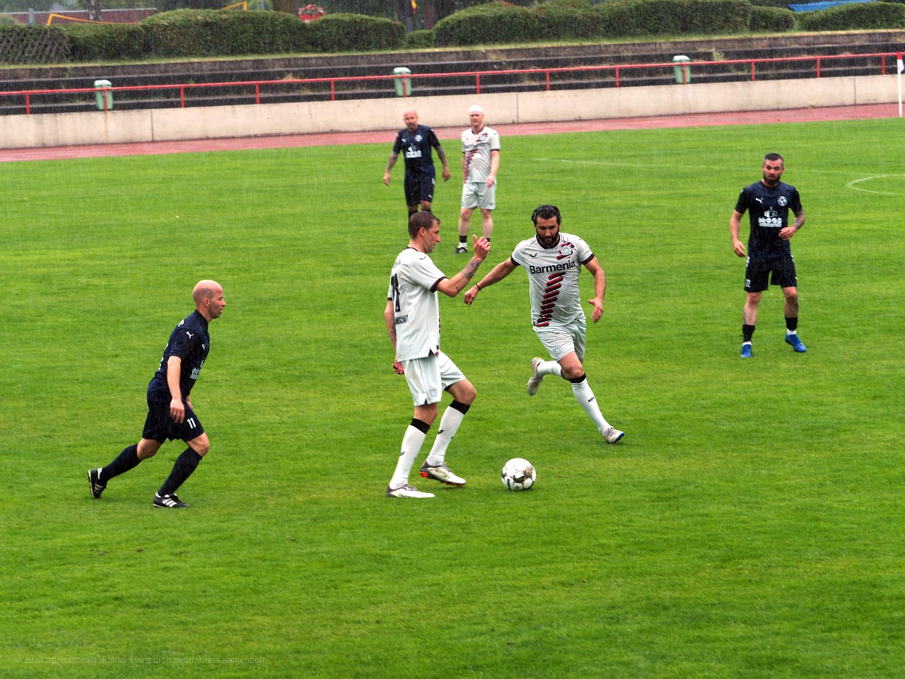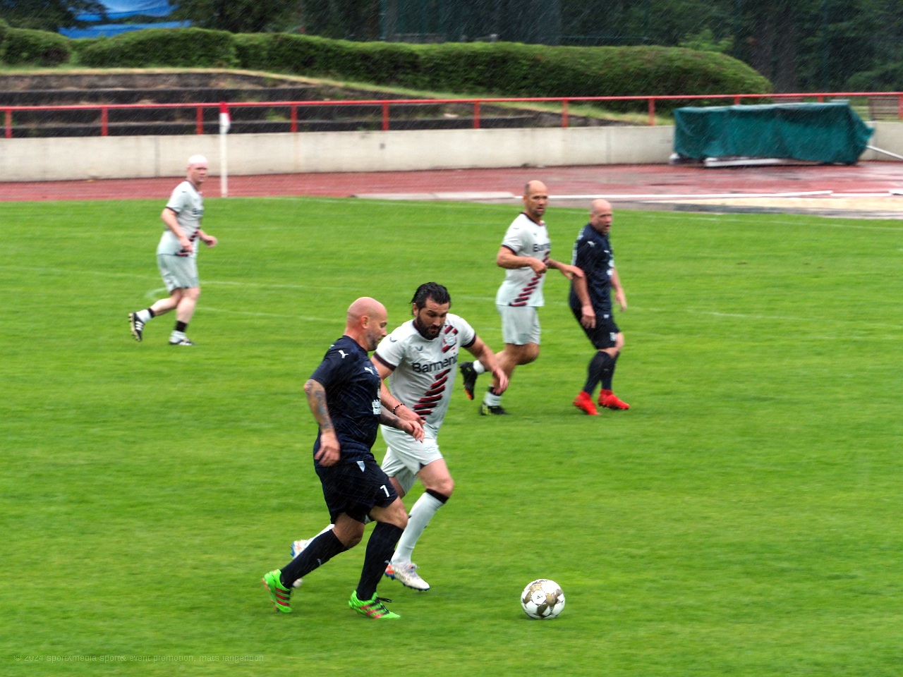 Das Tor zählte dann aber nicht, weil der Linienrichter eine Abseitsstellung eines Bayer Spielers monierte. Mit zunehmender Spieldauer fing es heftig an zu regnen, was aber am guten Niveau des Spiels nichts änderte. In der 10. Minute dann eine Riesenchance für den BFSV Atlantik, als ein Leverkusener Akteur gerade noch auf der Linie zur Ecke retten konnte. Die Ecke führte dann zum 1:0 für die Norddeutschen. Ein Kopfball eines Atlantik Angreifers landete unhaltbar für den Bayer Keeper im Tor. Zu diesem Zeitpunkt hieß der neue Deutsche Ü-40 Pokalsieger BFSV Atlantik 97. In der 14. Minute scheiterte Stefan Kießling mit einem fulminanten Schuss an BFSV Torhüter Danny Yayer. In der 15. Minute dann der Ausgleich für Leverkusen.